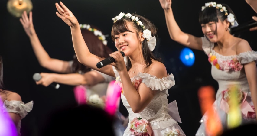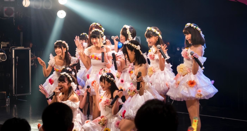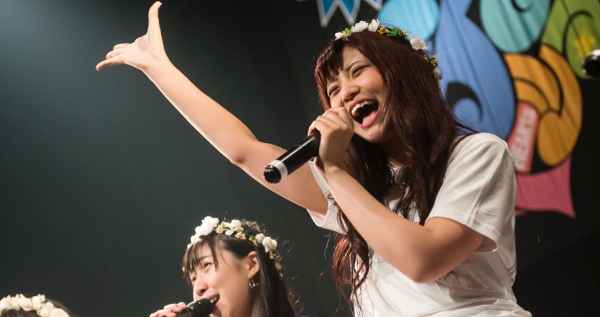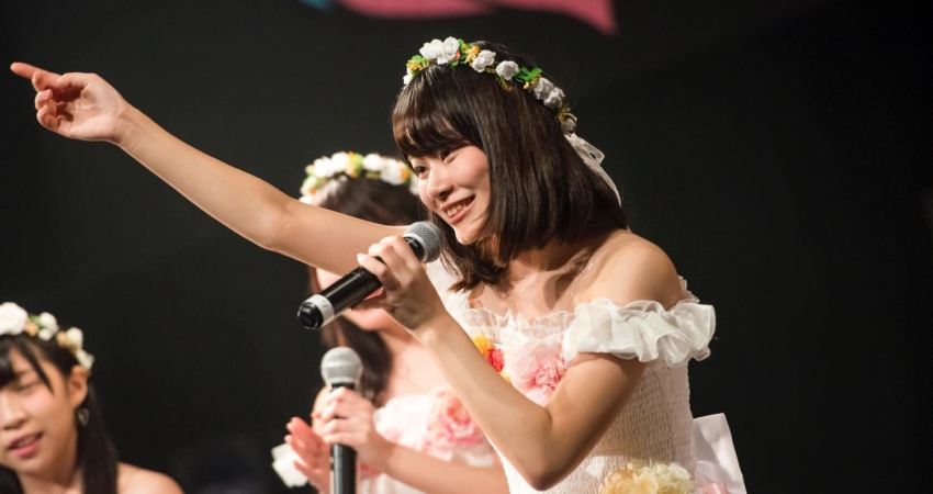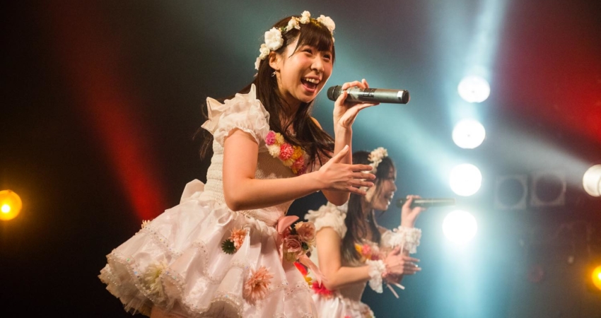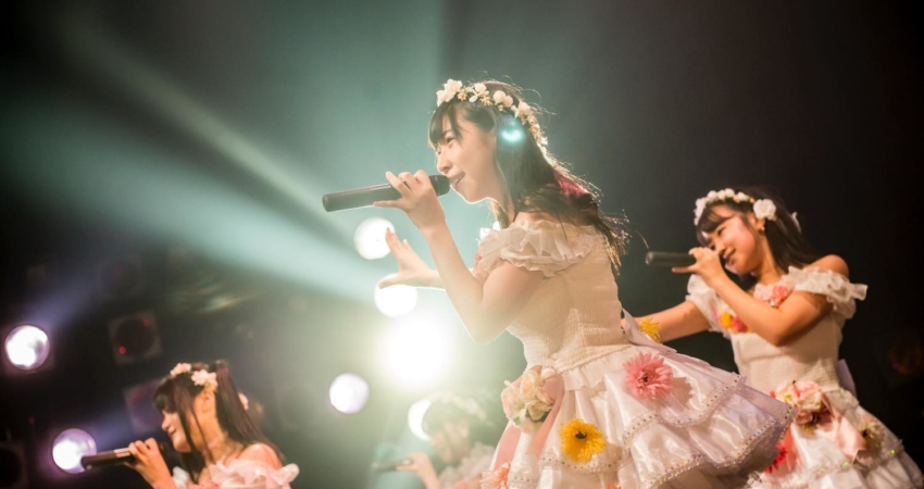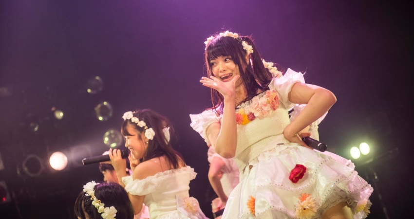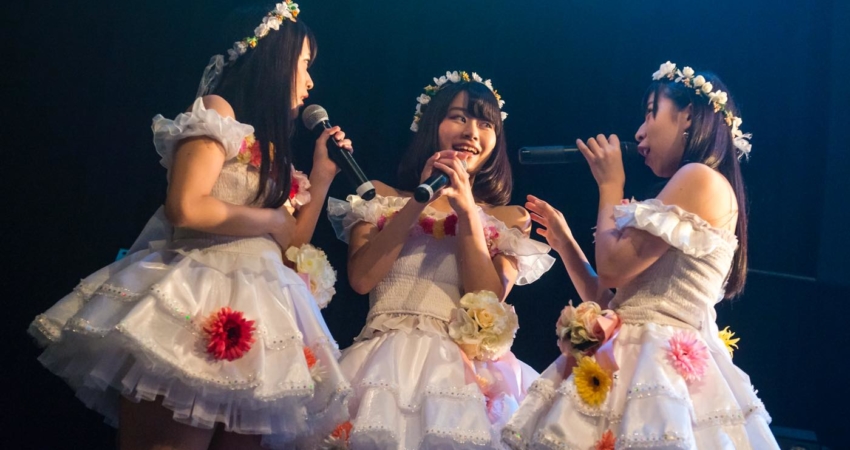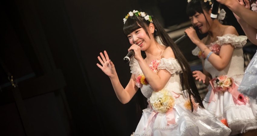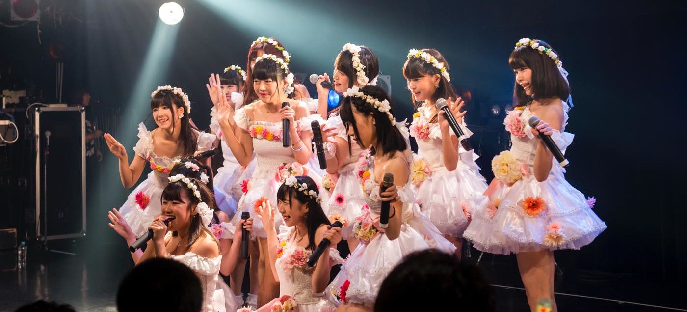 As all 11 current members of the group showed up on stage in their white dresses covered in flowers, they opened the show with their summer tour’s anthem, “Dreaming love”, and fan-favorite 2nd single “Sekai he habatake!”. The group paused quickly to introduce themselves one by one, with a specific emphasis on all four fresh faces who were making their official debut this day! Aki Imai, Risako Aise, Leia Shiroki and Shiika Koizumi are the four new members of the group from now on, and all also work at the Afilia branch cafes on the side.