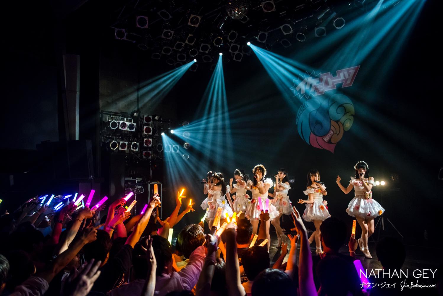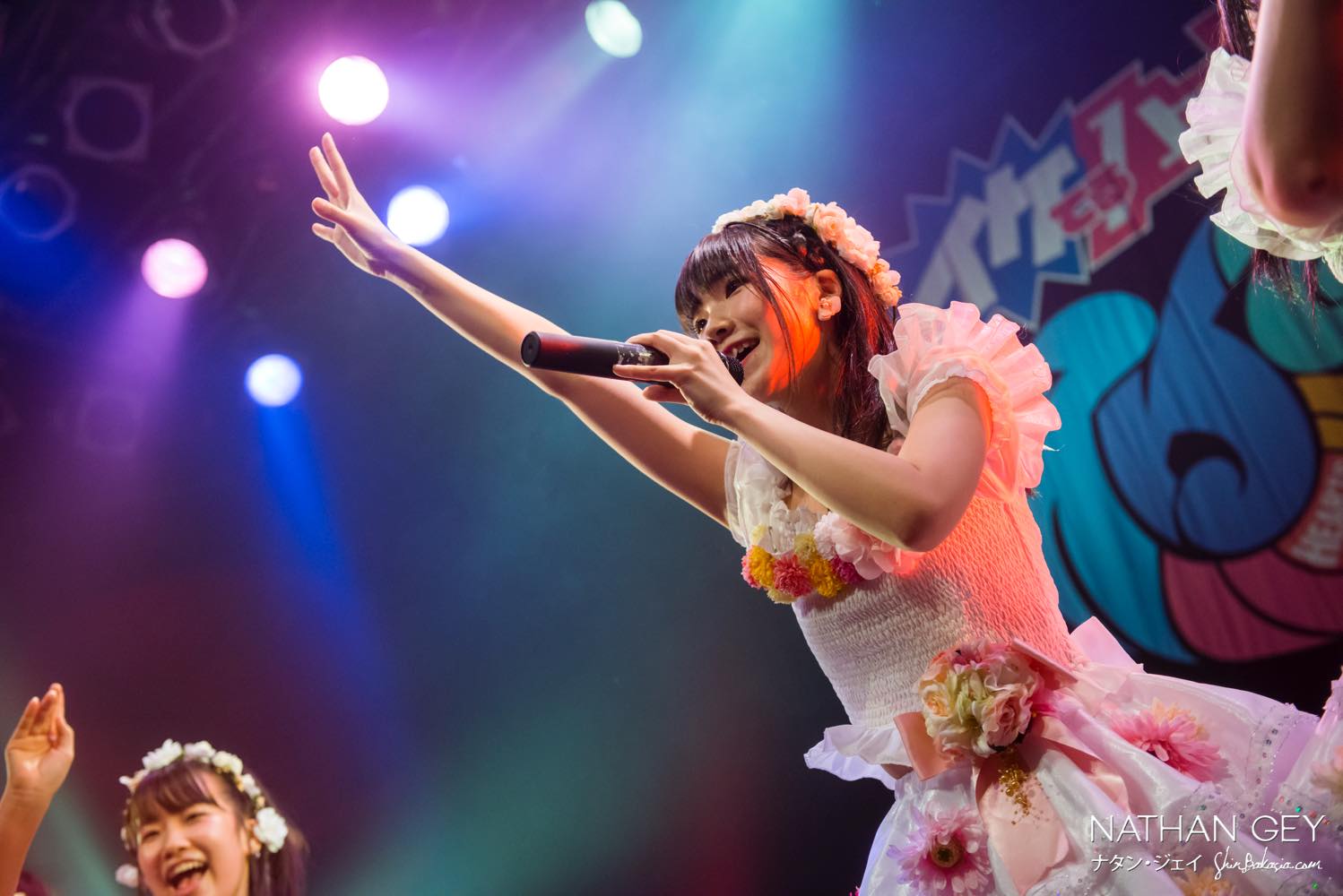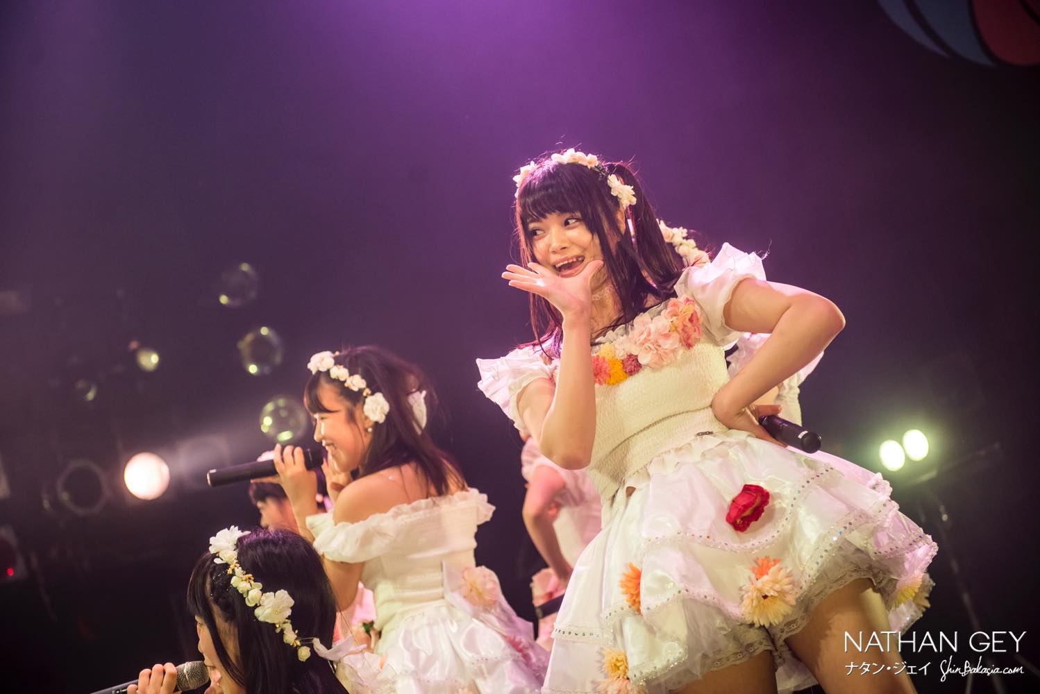 After their usual exciting introduction tune, the seven members appeared on stage wearing the pastel dresses from their debut single. They opened the day with their very first and latest single songs, Tsunku produced “Let’s Stand up!” and the dark “Zaishyou no Lucifer”, the youngest member, Nijika, already crying happy tears after a few seconds into the performance.