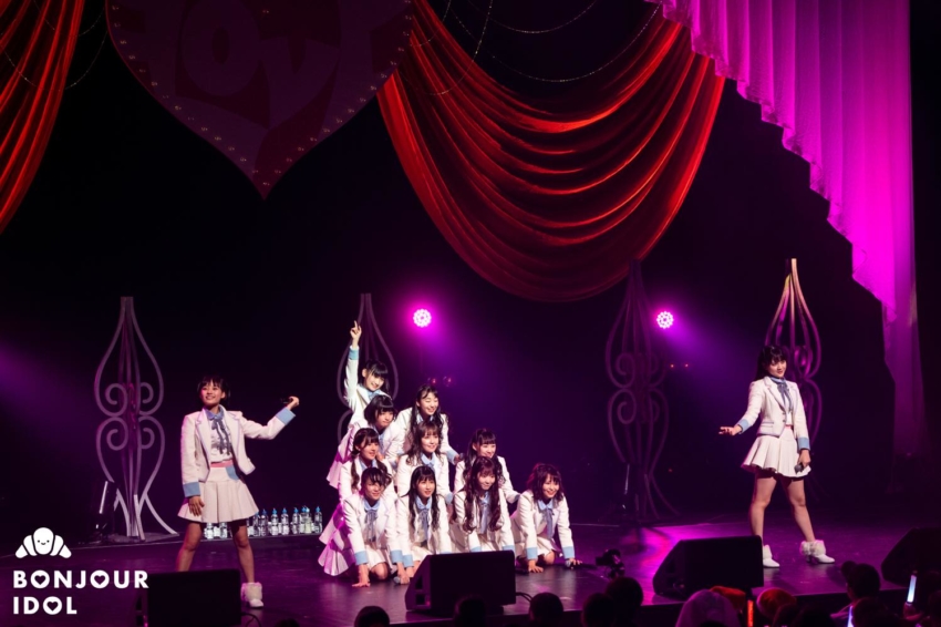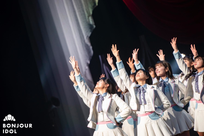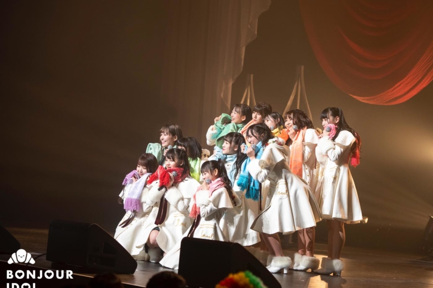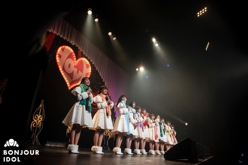 An encore took place in high spirits, and the twelve girls showed up on stage wearing beautiful white coats, specifically made for these two concerts. The front side of the coats were decorated with adorable burgundy red velvet ribbons, and Saitou Nagisa started the next song, “Todoite LOVE YOU♡”, melting the fans away with her multiple winks.