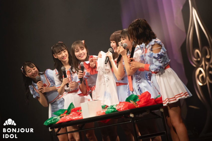 Speaking about Christmas, it is also about the gifts we give to our loved ones. That is what the 12 members of the group wanted to show off with a lottery raffle! The winners won random gifts among several goodies signed by the girls. Alternating between two groups of six during this little break, members changed outfits and came back dressed in promotional outfits for their second single “Bokura no Seifuku Christmas”, a pure white uniform with some pastel blue and pink details.
