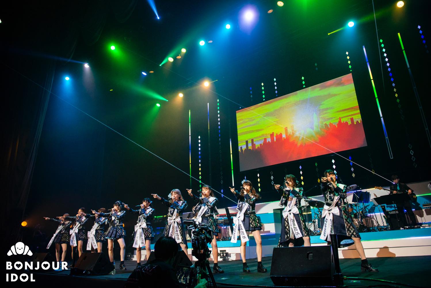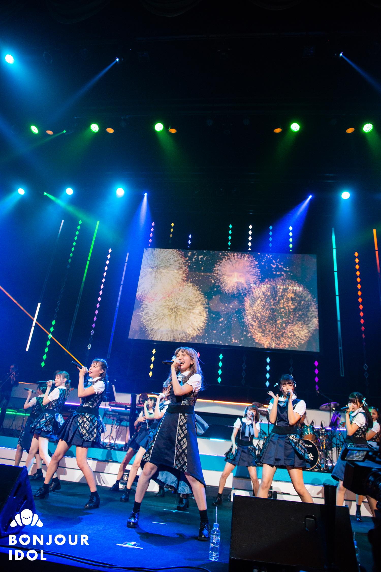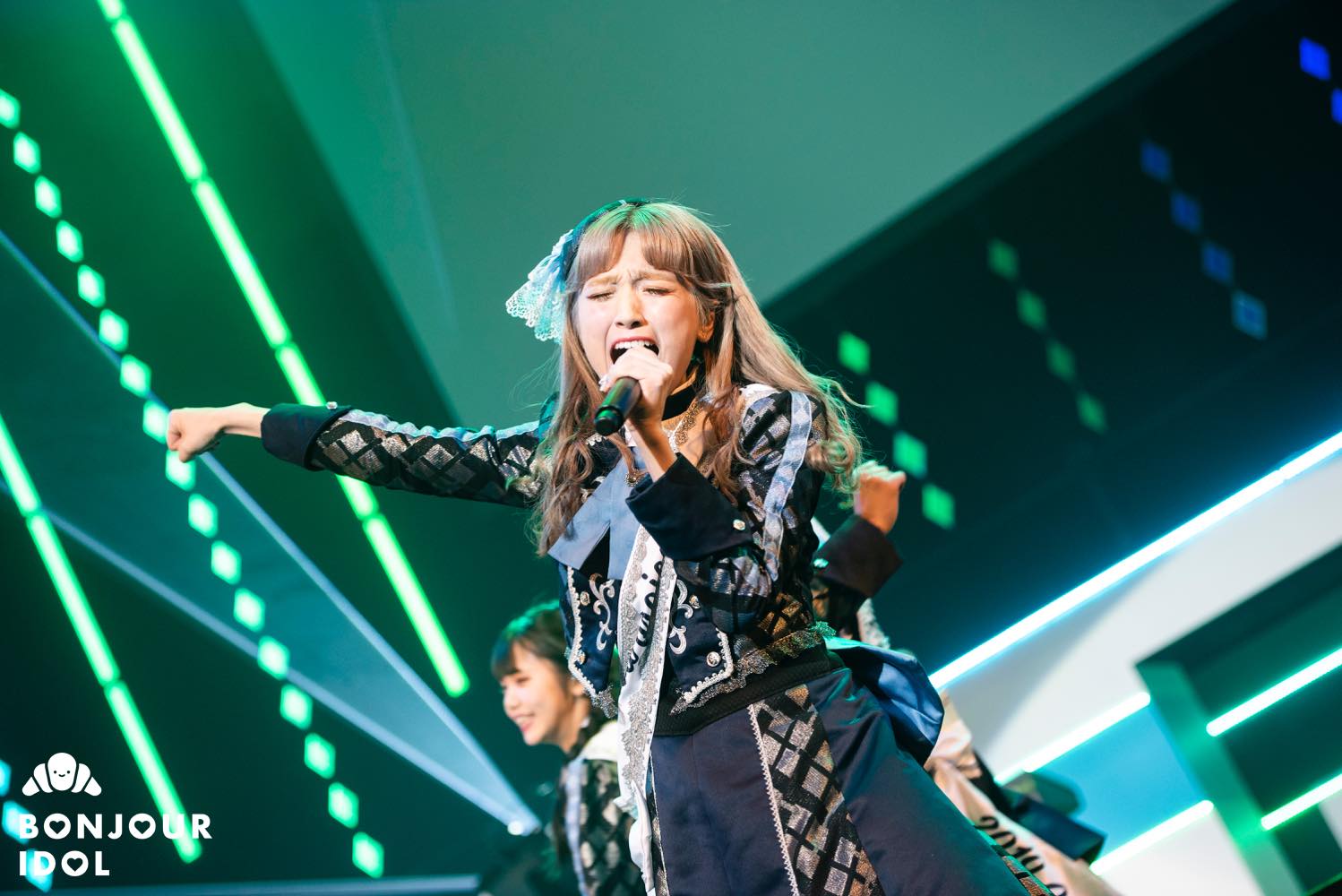 Yue Miyatani took center stage amidst the warm glow of red penlights as she sang her solo song “Message to ID”. Ruka Okonogi, Mahiro Hoshino, and Mizuki Tsushiro returned dressed in white and pale blue striped outfits to begin “Fighting Stars”, the rest of the group joining them in waves as the song continued.