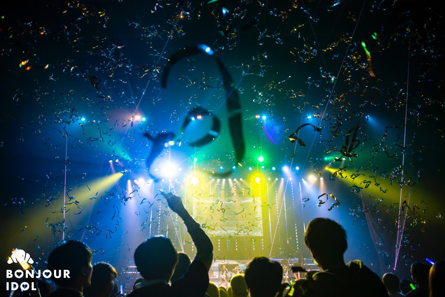 As the lights dimmed, a short video flashed back through the collage of live performances and events that akishibu project had spent together as dramatic music played. A 5-piece band took the stage and launched into the intro music to get the crowd lit up. akishibu project rushed out onto the stage to start off the evening with “New World” as streamers rained down. Moving right into “Summer☆Summer”, the members darted between the columns of CO2 erupting from the stage as they fanned their hands to combat the rising temperature in the venue.