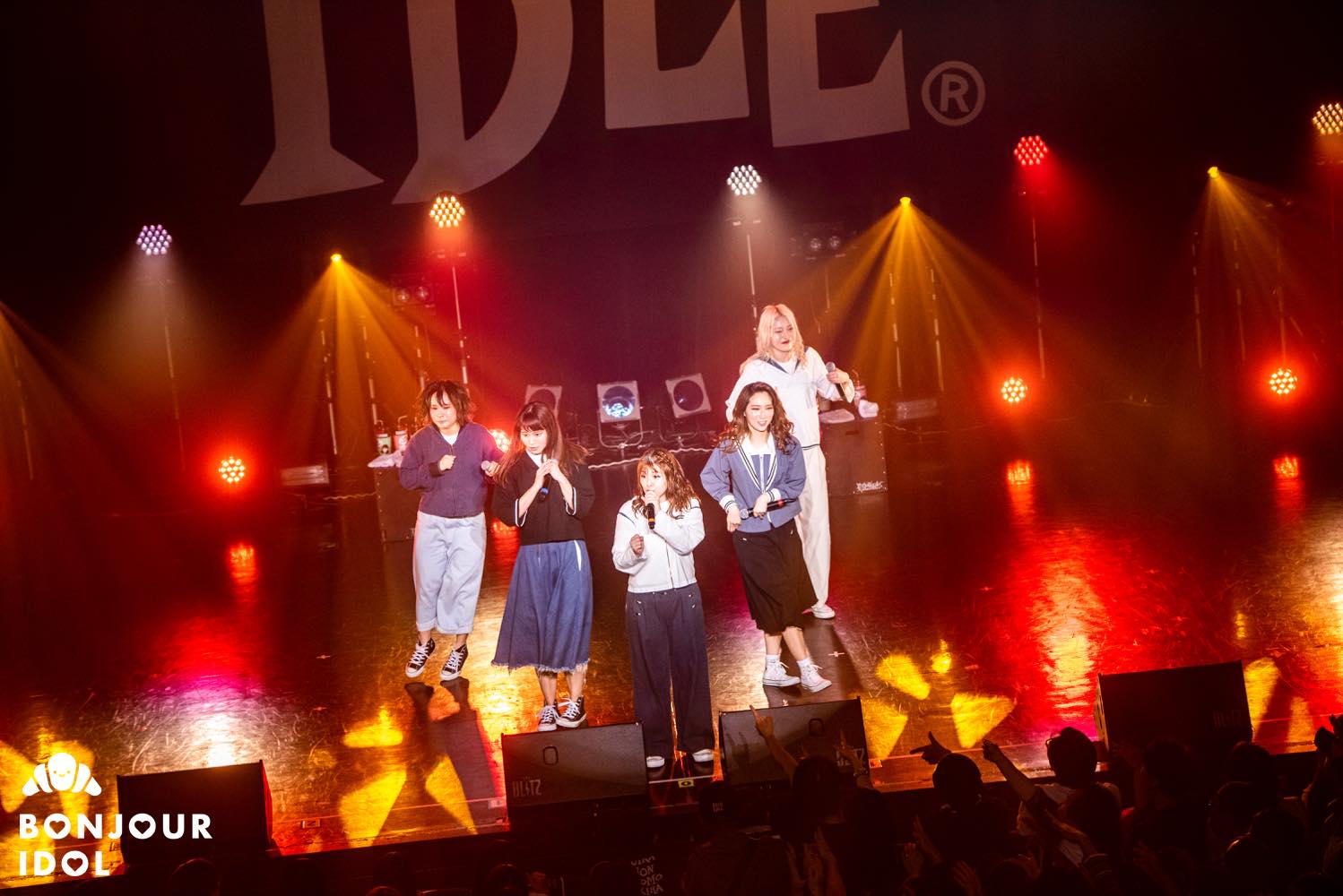 The fans don’t wait for very long before calling back their (not) idols on stage. While BILLIE IDLE® thank their audiences for contributing into the success of this tour, Pour Lui reminds everyone of an upcoming milestone. “This year will be my 10th anniversary since my debut as a singer and idol,” she starts, “For the Reiwa era, I want to go further! I want BILLIE IDLE® to go further!”. First Summer Uika then starts imitating 90’s model and talent Fujiwara Norika‘s breathy jerky speech to thank the fans, ending it with a “I love you all!” in Kansai dialect, welcomed by a round of applause as the fans start chanting Norika’s name as a response to the joke.