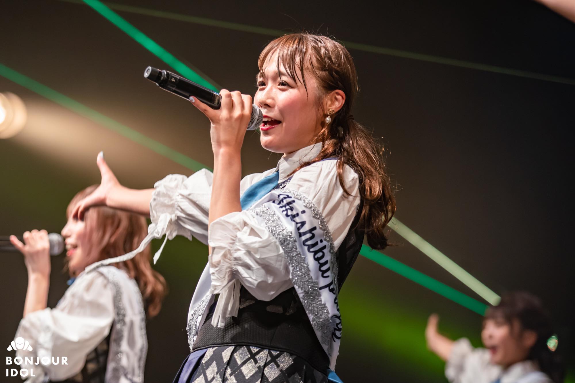 Taguchi Miiro returned to the stage, announcing the appearance of several special guests, recently graduated members Okonogi Ruka, Hoshino Mahiro, Tsushiro Mizuki, and Yuringo taking the stage for “Dream in a sea” followed by Iseki Ami, Funaki Saori, Ishikawa Natsumi (soon-to-graduate from Last Idol Family group Love Cocchi), Arakawa Yuna, and even akishibu project founder Ichigo Rinahamu (CY8ER)! With most of the members of akishibu project past and present assembled, the performance continued on with “Sora no Kanata” as hands swayed from side to side.
