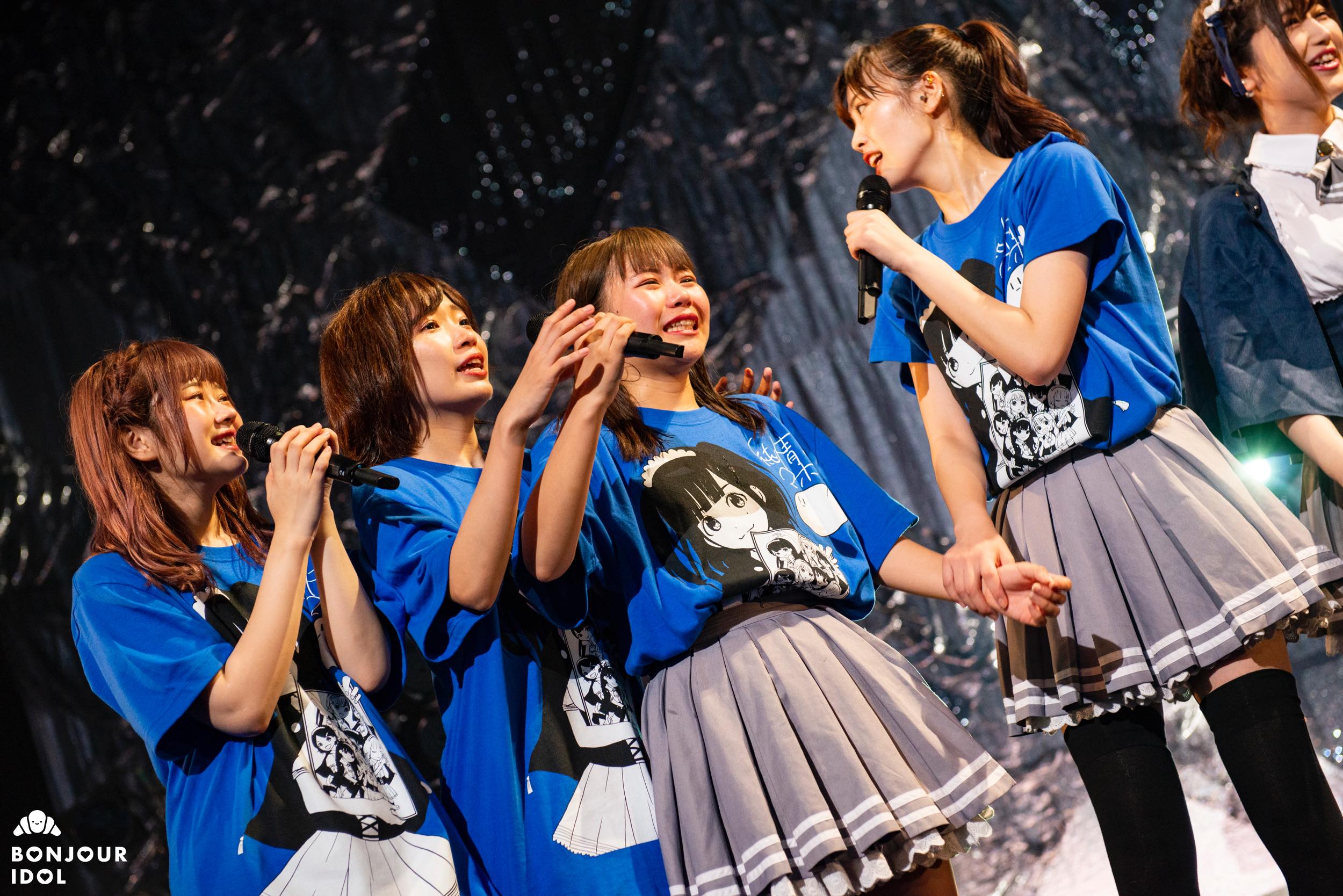 The encore call resonated immediately after the last notes of “Sore dake ga, ikiru imi nanda”, and Maho showed up on stage again with her fellow members of Junjou no Afilia, wearing the special tee-shirt designed for the event, picturing a cartoon version of Maho. “You’re stretching Maho’s face!” Maho claimed laughing and pointing at Amina‘s chest – Amina’s curvy body being the main topic of quite a number of innocent and playful jokes from her friends. The special guests of the day joined them a few minutes later, in a little talk bridging older and newer generations of the same group, before Kaori, Yumi and Kana brought out flowers for their leader, for whom they had prepared a speech. The audience was able to feel all the love and respect Junjou no Afilia members have for Maho, who could not contain it any longer and burst into tears.