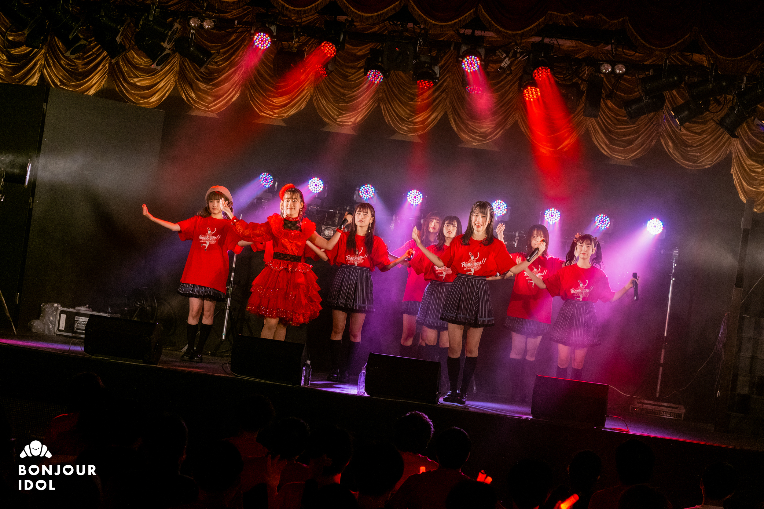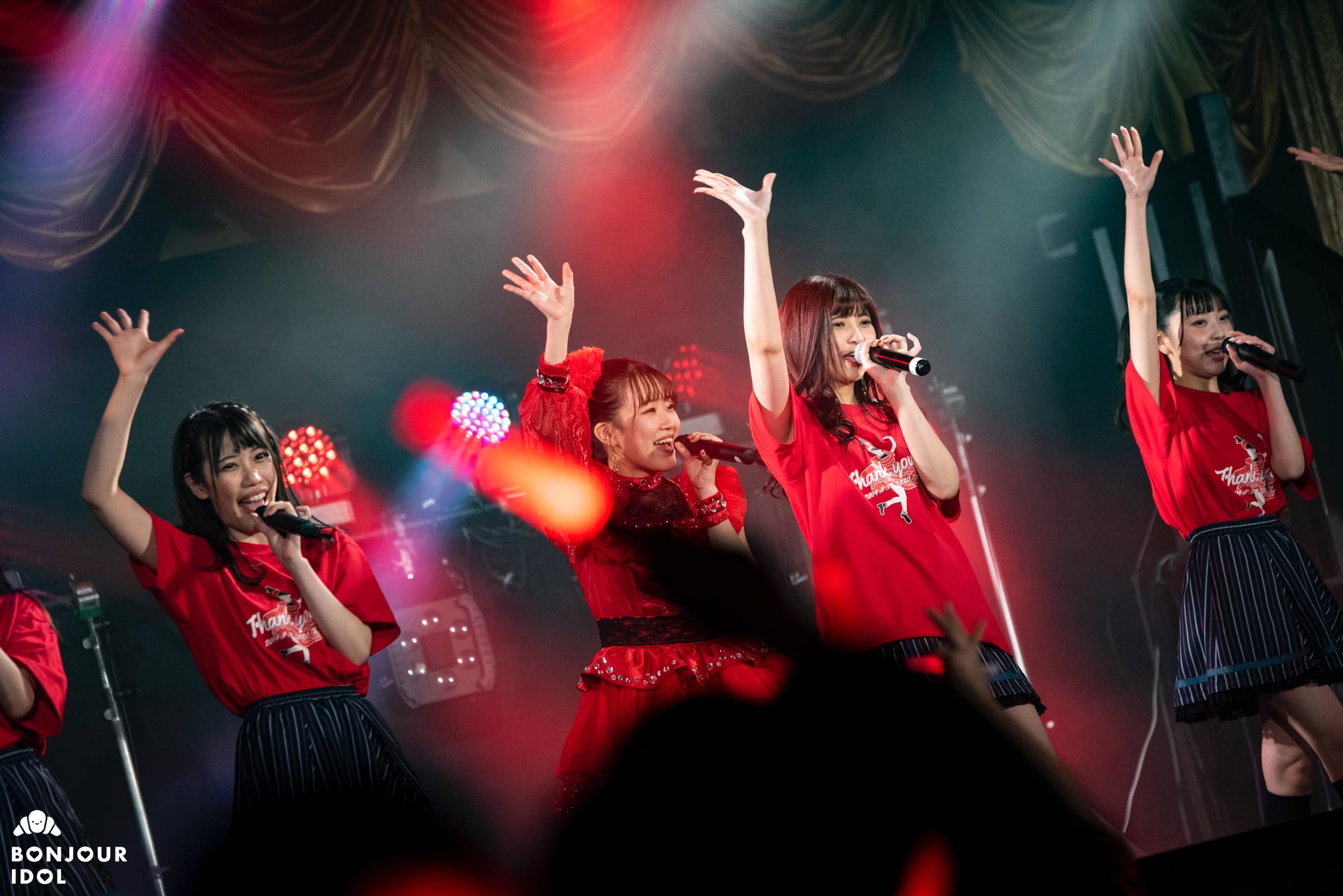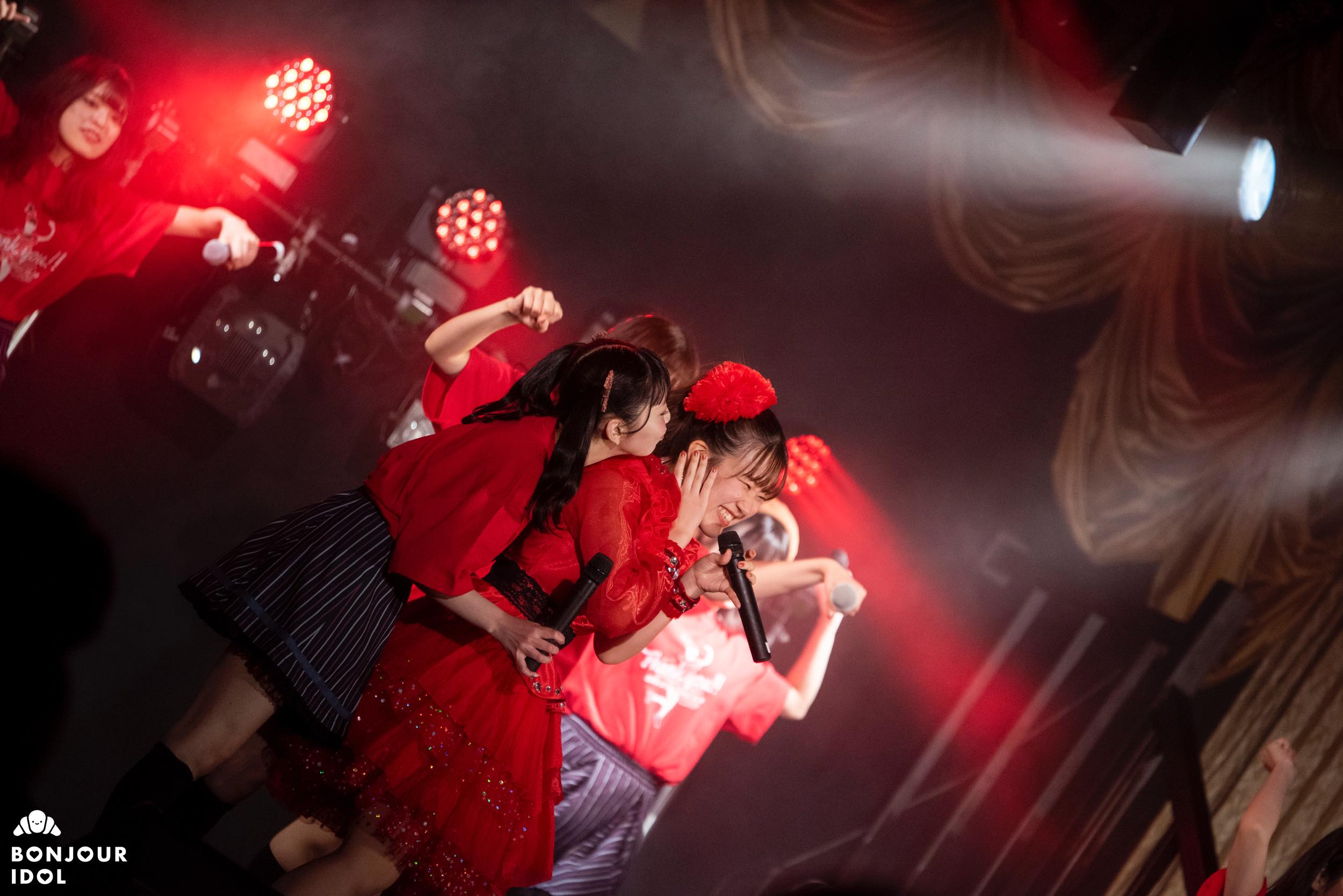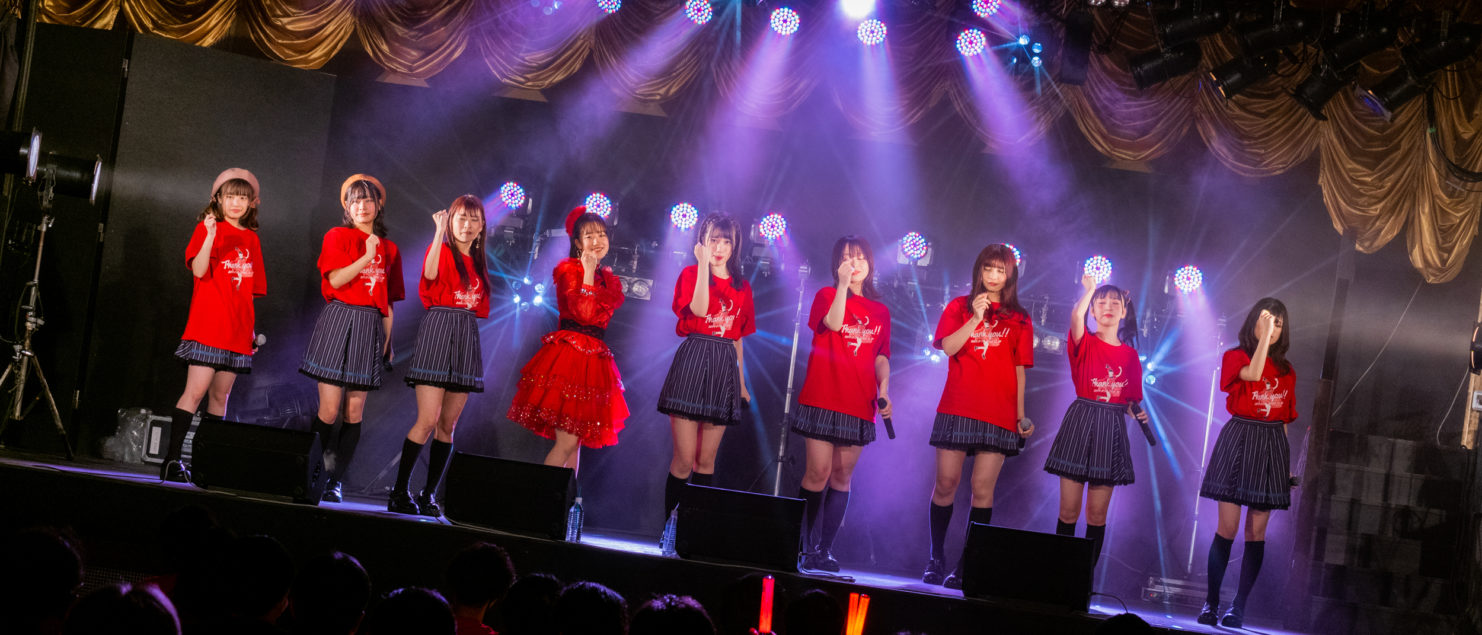 Despite the measures against the corona virus not allowing the audience to shout an encore, the fans immediately started clapping to bring the members back on stage. The encore opened on a series of heartfelt messages from the members to Nijika. Iketeru Hearts appeared again wearing red tee-shirts, and Nijika had changed into a beautiful bright crimson dress for her graduation ceremony. They joined voices on “I will”, as the members and audience started feeling overwhelmed with emotions.