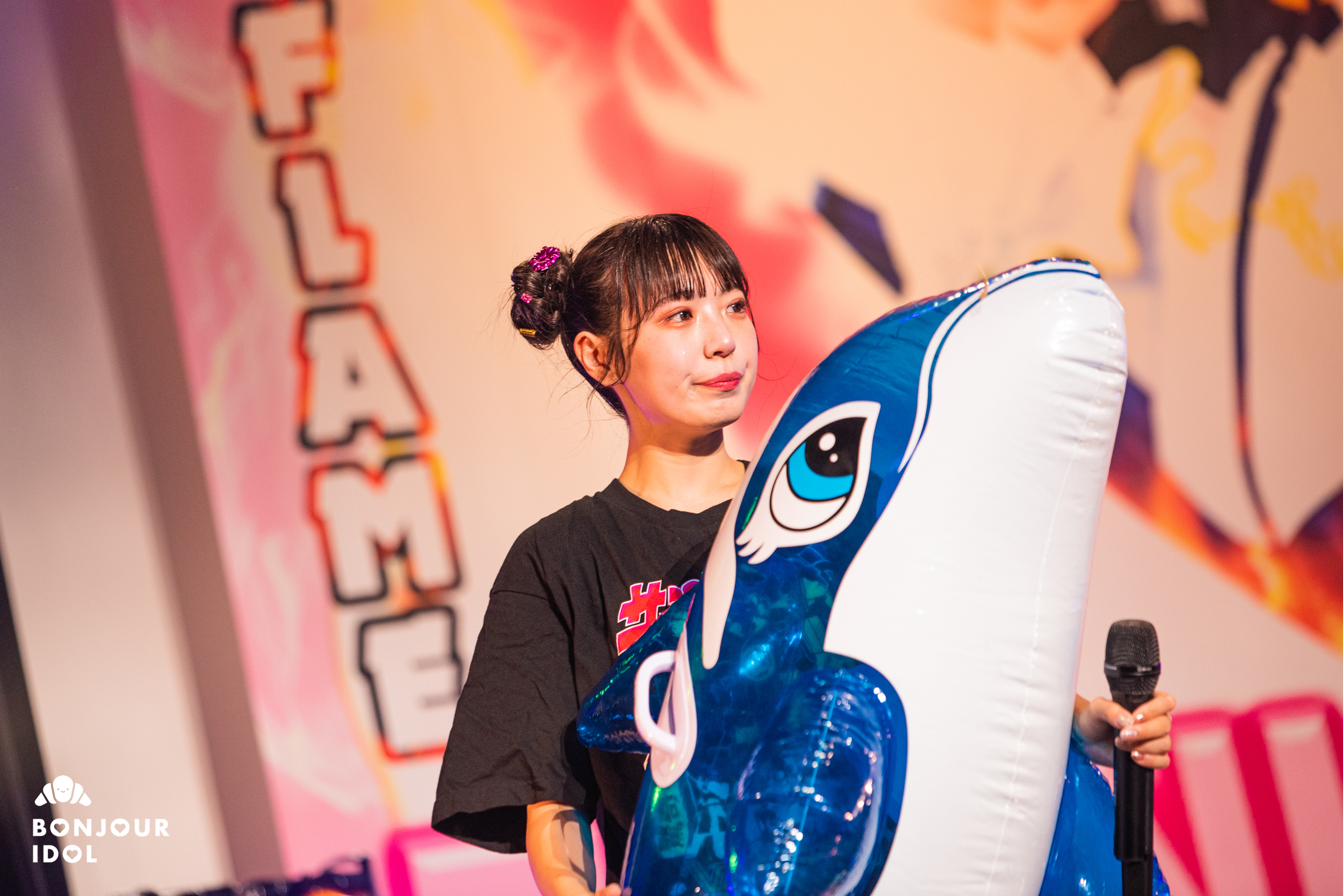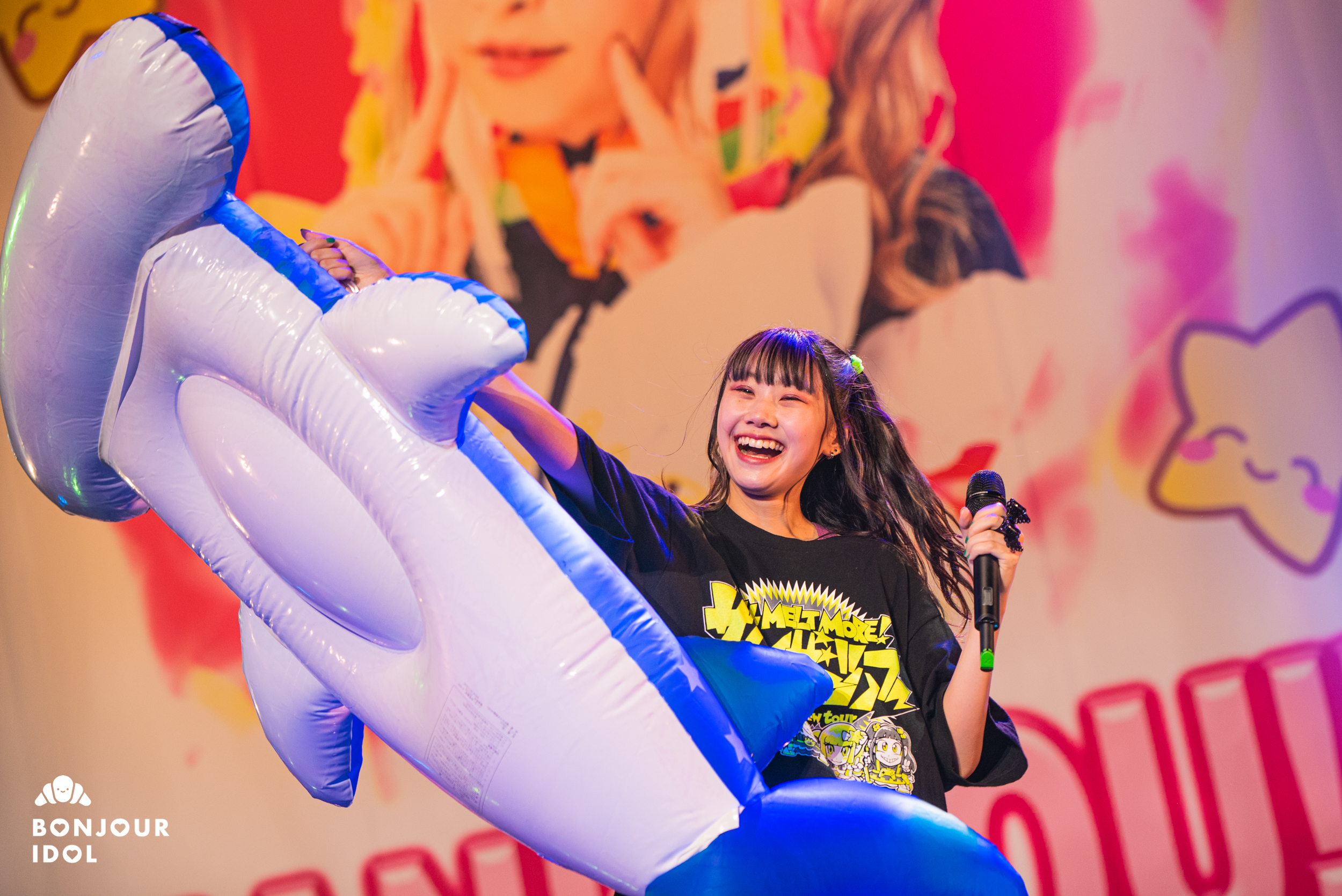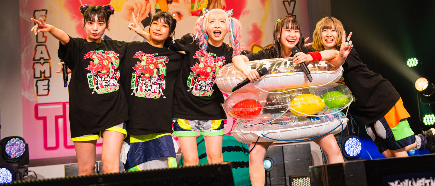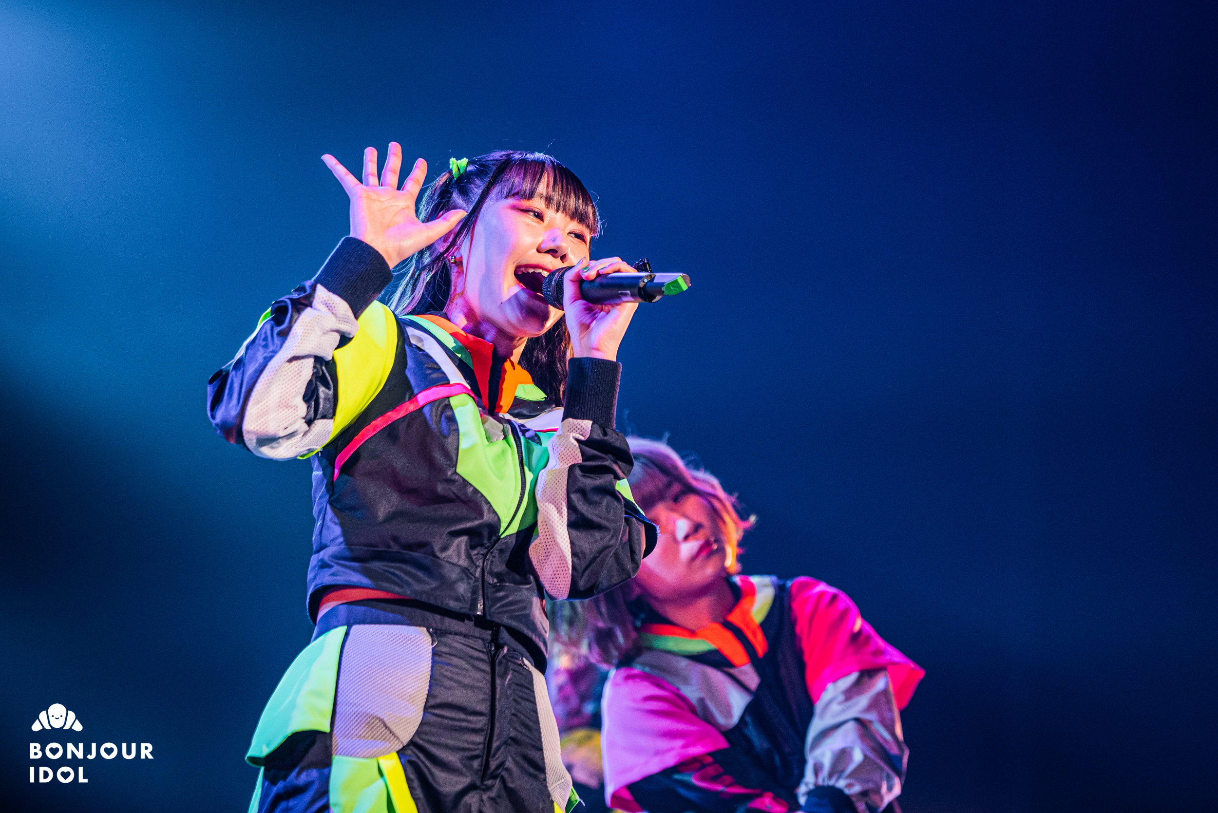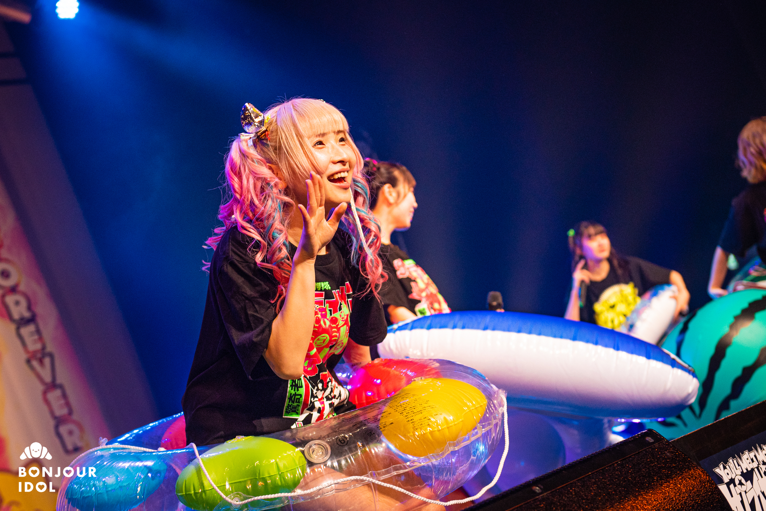 After posing for the commemorative photo with the audience in the background, the members shared their feelings about the performance, noting how the pandemic had gave them more time with Younapi as her original retirement (March 27, 2020) had been postponed and they had continued to work as a group in the interim. Rocking through “Nigenai!!”, Younapi’s last performance of You’ll Melt More! concluded with longtime closing number “Natsu on Blue”, the members running around the stage with inflatable pool toys.