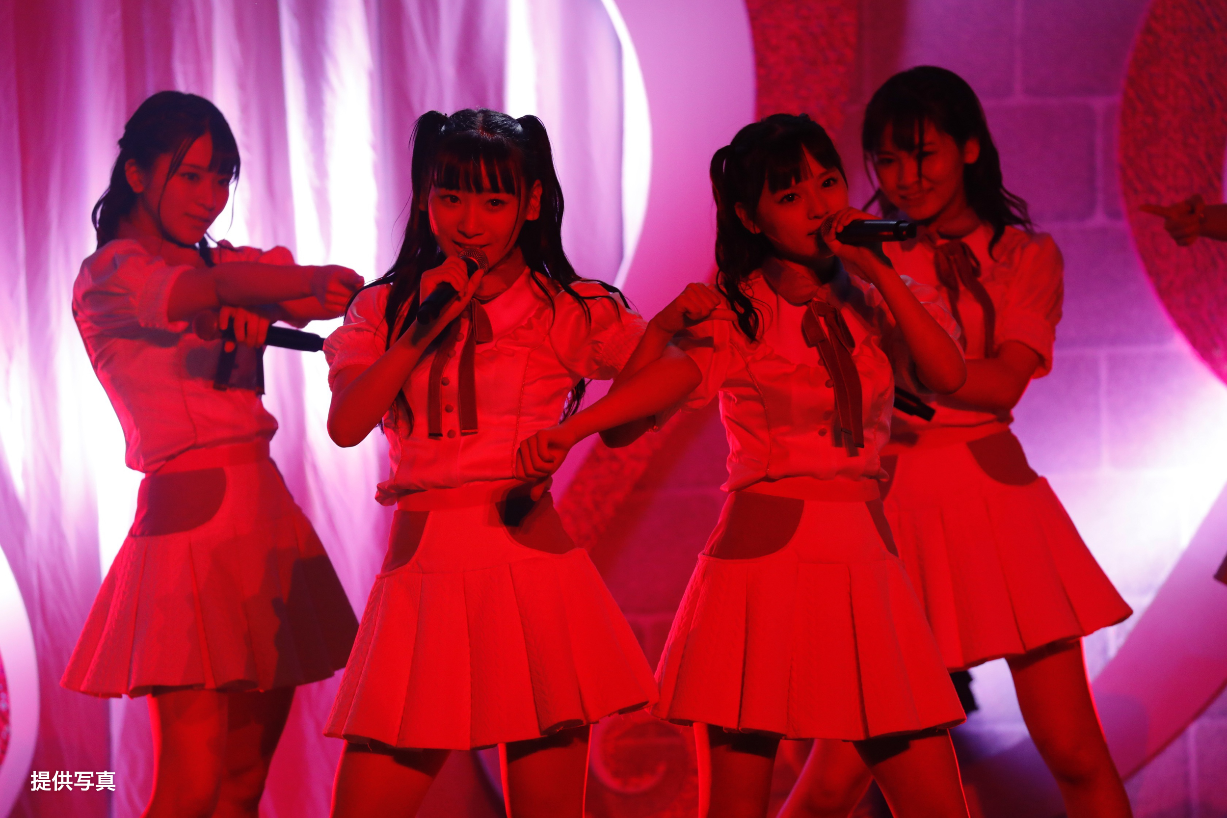 Après un court MC et un changement de tenue, 6 membres ont interprété “Kioku no Doko ka de” avec une mise en scène utilisant les deux étages du décor de la scène. Ainsi, rejointes par leur camarades, “Teokure caution” finit cette première partie dans une salle entièrement teintée de rouge écarlate.